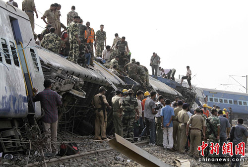中新網(wǎng)5月28日電 綜合報(bào)道 當(dāng)?shù)貢r(shí)間28日凌晨1時(shí)30分,在印度東部西孟加拉邦西米德納布爾附近,一輛高速行駛的旅客列車(chē)遭襲致13節(jié)車(chē)廂脫軌,其中3節(jié)車(chē)廂又與對(duì)面駛來(lái)的貨運(yùn)列車(chē)相撞。目前為止,事故至少造成65人死亡,200多人受傷。