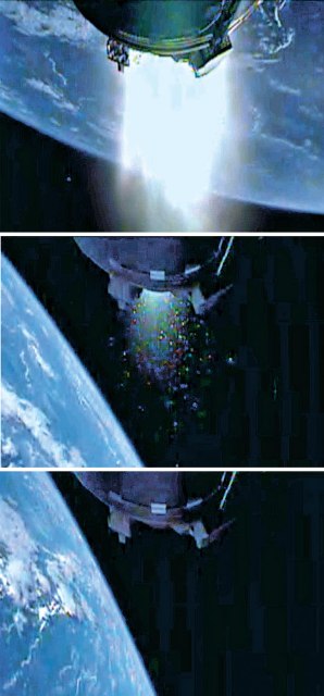 韓國方面公布的這三張照片,分別是兩段火箭的引擎正常點(diǎn)火發(fā)動的照片(上)、兩段火箭的燃素即將熄滅時的照片(中)和航天器因火箭上段未能正常分離的整流罩而偏離軌道的照片(下)。
