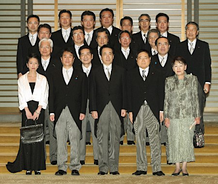 前任鳩山內(nèi)閣中,有11名大臣留任,包括外務(wù)相岡田克也、防衛(wèi)相北澤俊美、國土交通相前原誠司和郵政和金融事務(wù)擔(dān)當(dāng)相龜井靜香。官房長官則由前國家戰(zhàn)略擔(dān)當(dāng)相仙谷由人轉(zhuǎn)任。首次入閣的有公務(wù)員制度改革擔(dān)當(dāng)相玄葉光一郎、行政改革擔(dān)當(dāng)相蓮舫、財務(wù)相野田佳彥等5人。反小澤“先鋒”枝野幸男則繼任黨干事長。