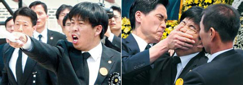 韓國去年5月29日為盧武鉉舉行葬禮。遺體告別儀式上,當(dāng)李明博起身準(zhǔn)備向盧武鉉遺像獻花時,白元宇突然朝他大喊“你是政治殺人犯”“請李總統(tǒng)道歉”。