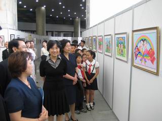 致辭結(jié)束后,出席開幕式的領(lǐng)導和學生們參觀了書畫展。萬景臺少年宮寬敞明亮的大廳頓時人頭攢動、熱鬧非常,一塊塊高大的展板前,身穿校服、圍系紅領(lǐng)巾的朝鮮少年兒童們興高采烈地觀看著一幅幅書畫作品。上海市對外文化交流協(xié)會代表團團長高嶺女士參觀書畫展后表示,朝鮮少年兒童的書法和繪畫水平高超,顯示出了扎實的藝術(shù)功底,且主題性強,表達了他們對中朝友誼的祝福。朝鮮對外文化聯(lián)絡(luò)委員會副委員長田英進也表示,中國少年兒童的想像力、創(chuàng)造力豐富,通過畫作表現(xiàn)出了積極向上的精神面貌和對未來的向往。