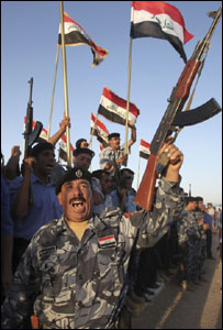 中新網(wǎng)6月30日電 據(jù)英國廣播公司報(bào)道,29日,伊拉克政府軍士兵比預(yù)定交接時(shí)間提前一天開始慶祝美國軍隊(duì)正式撤出巴格達(dá)。