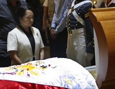 遺體其后由靈車送到先夫阿基諾墓旁落葬,儀仗隊鳴放21槍向阿基諾夫人致敬。整個運(yùn)送靈柩過程歷時8小時,送別阿基諾夫人民眾連綿18公里。