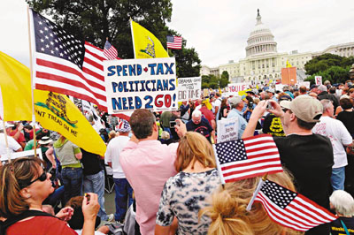 示威者逼爆賓夕法尼亞大道,連綿數(shù)個(gè)街區(qū),齊向國(guó)會(huì)山莊浩浩蕩蕩前進(jìn)。他們高舉奧巴馬和美國(guó)眾議院議長(zhǎng)佩洛西的肖像,以及寫(xiě)滿(mǎn)“不要更多的開(kāi)支,不要更多的稅收,不要更多的謊言”、“支持奧巴馬的醫(yī)療改革方案等于自殺”等各種各樣的標(biāo)語(yǔ)。