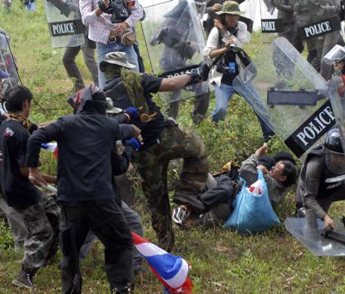 由于當?shù)鼐用癫粷M黃衫軍在當?shù)厥就,村民擔心會影響國家聲譽和柬埔寨的關(guān)系,因此村民在通往柏威夏寺的路上搭起路障,防暴警察也全副武裝,防止示威者通過。電視片段所見,黃衫軍多次揮動長棒,與防暴警察和試圖阻止他們進入柏威夏寺一帶的村民發(fā)生沖突(見圖)。省政府官員表示有數(shù)十人在騷亂中受傷,其中二十人要送院治理,一名送院者頸部受到槍擊。事件最后在警方調(diào)解下解決。