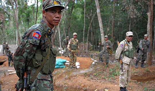 世界法庭在1962年裁定古寺歸柬埔寨所有,但由于柬埔寨數(shù)十年來的戰(zhàn)爭導(dǎo)致兩國邊界地區(qū)布滿地雷,因此,柬泰邊界一直沒有劃定界限。