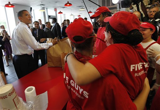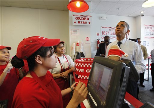 據(jù)《星島日報》報道,奧巴馬到華盛頓一家連鎖快餐店買漢堡包,期間又與市民握手問好,他點了芝士漢堡包及薯條作午餐,還請下屬進食,以及隨行拍攝的電視臺職員。在排隊期間,奧巴馬吃了點零食,與其他顧客聊天,也有人要求與他拍照留念。