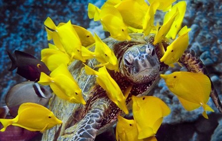據(jù)報道,攝影師麥克.羅伯茨(Mike Roberts)在夏威夷普阿科(Puako)潛水時,發(fā)現(xiàn)一只海龜安靜地停留在水中,等待一群顏色鮮艷的魚在其身邊忙碌地“工作”,為它啄去身上的寄生物,替它“洗澡”。