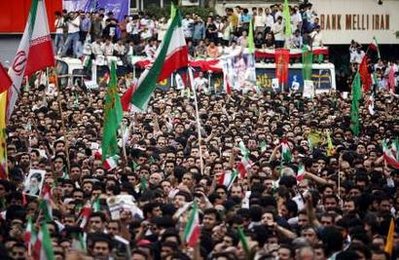 據(jù)英國廣播公司報(bào)道,周日,狂喜的支持者高舉伊朗國旗和艾哈邁迪內(nèi)賈德的大幅照片,涌入德黑蘭的主要街道,慶祝艾哈邁迪內(nèi)賈德大選勝利。