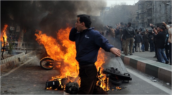 在德黑蘭的部分地區(qū),示威者向警察投擲石塊,并奪取了警方汽車與摩托車,并放火點燃。
