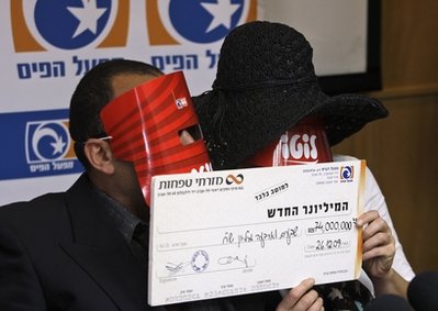 以色列通常會保護中獎?wù)叩纳矸,這對夫婦從頭到腳全副武裝現(xiàn)身領(lǐng)獎。丈夫說:“我要感謝我的妻子,是她催我去查看一下彩票,否則我都不會發(fā)現(xiàn)中獎了!彼麄儽硎具沒想好要怎么處理這筆錢。