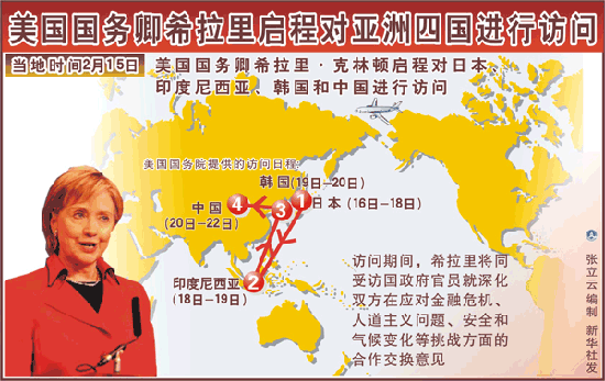 據(jù)美國《洛杉磯時(shí)報(bào)》網(wǎng)站14日?qǐng)?bào)道,昨天,就在國務(wù)卿希拉里·克林頓為其上任后的首次海外之行做準(zhǔn)備時(shí),她承諾將奉行“既不沖動(dòng)也不太注重意識(shí)形態(tài)的”外交政策。她此次在訪問亞洲時(shí)將面臨一系列敏感問題。
