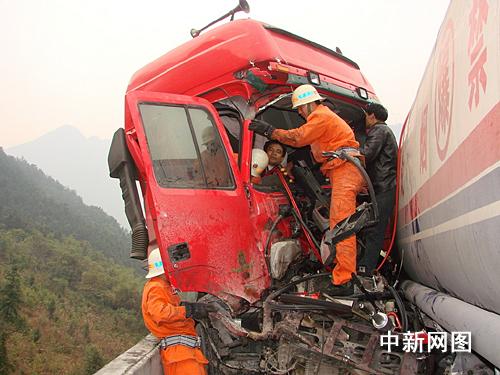 交警在南行東坪和梅花出口和北行乳源出口實(shí)施車輛分流制,并在南行云巖坡頂實(shí)施臨時(shí)禁行交通管制。消防官兵則兵分兩路,一組人員著防化服佩戴空氣呼吸器對(duì)危險(xiǎn)品運(yùn)輸車實(shí)施堵漏,另一組對(duì)追尾貨車內(nèi)被困人員進(jìn)行救援。經(jīng)過消防官兵近一個(gè)小時(shí)的奮力營(yíng)救,于10時(shí)55分將被困人員救出,并及時(shí)送往醫(yī)院救治。