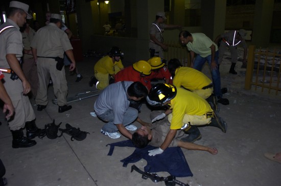 當時體育場內(nèi)正在進行足球賽,體育館頂部水泥石塊突然坍塌,兩名防暴警察不幸身亡。比賽不得不暫停40分鐘。