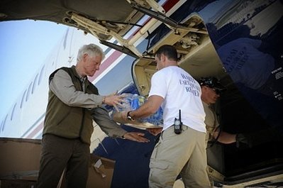 克林頓抵達(dá)海地后協(xié)助工作人員從飛機(jī)上搬卸飲用水。