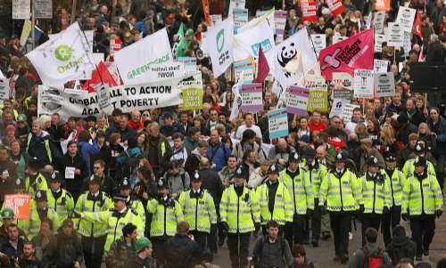 示威者行經(jīng)國(guó)會(huì)大樓,吹響哨子,大喊“我們?cè)骱捭y行”,標(biāo)語(yǔ)五花八門,有“人民為先、利潤(rùn)居后”、“離開(kāi)伊拉克和阿富汗”等,部分語(yǔ)句則較為激進(jìn),如“問(wèn)吊銀行家”、“沖擊銀行”。當(dāng)他們行至唐寧街的首相府時(shí),紛紛報(bào)以噓聲。