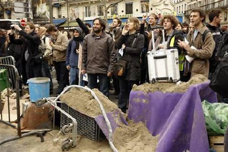 索邦大學(xué)(Sorbonne)學(xué)生們盛裝上演了一系列街頭活動,其中有學(xué)生身穿中世紀(jì)服裝,表演了場“薩科齊受審”的模仿劇。