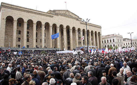 大約2萬(wàn)名反總統(tǒng)薩卡什維利的示威者周五(10日)聚集在議會(huì)外。薩卡什維利早前要求與反對(duì)派進(jìn)行對(duì)話,并保證改善該國(guó)民主。但薩卡什維利拒絕辭職。