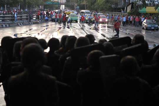 軍方凌晨開始對(duì)占據(jù)曼谷勝利紀(jì)念碑主要路口的示威者采取驅(qū)散行動(dòng),引發(fā)激烈沖突。沖突點(diǎn)距離“紅衫軍”抗議主場——曼谷總理府——只有數(shù)公里。軍方和示威者以催淚瓦斯、實(shí)彈和汽油彈互相攻擊。至中午時(shí)分,軍方向市中心的示威者開槍并發(fā)射高壓水炮。