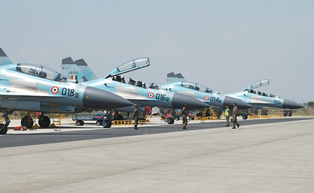 印度空軍蘇-30MK戰(zhàn)機(jī)群整齊停放在高原機(jī)場上(資料圖)