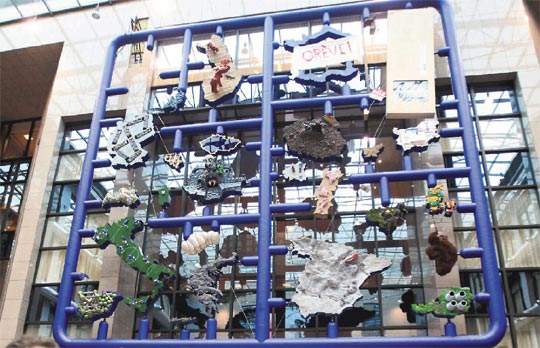 施爾尼(David Cerny)的這個(gè)創(chuàng)作,上周末高掛在比利時(shí)布魯塞爾歐盟總部入口。眼尖的人馬上發(fā)現(xiàn)有點(diǎn)不對(duì),保加利亞竟以一堆看似蹲式馬桶的圖像構(gòu)成,法國(guó)就是個(gè)空洞的法國(guó)地圖,上面貼著“罷工中”。德國(guó)的代表圖像,竟是幾道公路構(gòu)成類似納粹的符號(hào),波蘭牧師撐起同性戀彩虹旗。英國(guó)呢?根本沒有英國(guó),因?yàn)橛?guó)一向?qū)W盟抱有敵意,不肯加入歐元區(qū)。