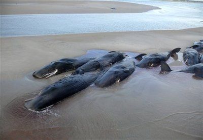 去年11月,150頭領(lǐng)航鯨在塔斯馬尼亞擱淺,雖經(jīng)救援人員全力搶救仍沒(méi)能使它們重回大海。就在一周多以前,60頭領(lǐng)航鯨再次在這一區(qū)域擱淺,救援人員只救活了其中的11頭。(陽(yáng)光)