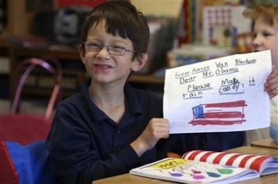 即使不是現(xiàn)實(shí)的復(fù)雜議題,小孩異想天開的古怪愿望,奧巴馬要實(shí)行起來亦不容易。7歲的阿龍就寫道:“請(qǐng)令天空下糖果雨!”另有兒童希望奧巴馬讓全球兒童放假一天,又有兒童畫了一個(gè)地球,命名為“奧巴馬樂園”。