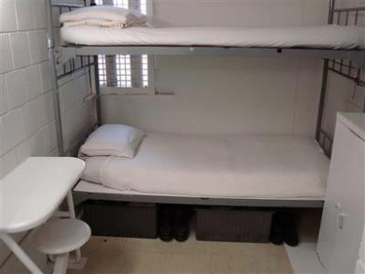 圖片顯示囚室異常狹小,只夠站立、漱洗和換衣,與麥道夫和妻子魯思居住的曼哈坦700萬美元豪華公寓相比,一夕之間,有著天壤之別。