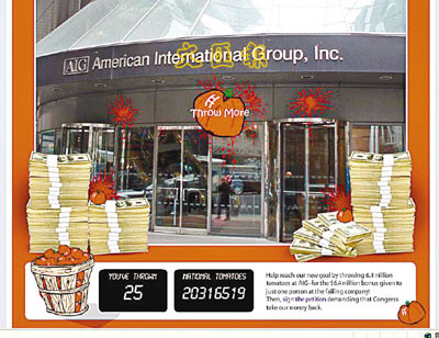 中新網(wǎng)3月25日電 據(jù)香港《明報》25日援引外電報道,美國AIG花紅風(fēng)暴,令民眾氣憤難平,自由派網(wǎng)站日前在網(wǎng)上開設(shè)“擲西紅柿”泄憤游戲。網(wǎng)民們可邊詛咒、邊瞄準AIG大樓入口圖片狂擲虛擬西紅柿。