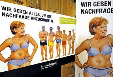 據(jù)法新社報道,德國一家內(nèi)衣公司5月1日在柏林著名商業(yè)街庫達(dá)姆街推出了一個1000平方英尺的巨幅電子廣告牌,廣告牌上是德國政治家著內(nèi)衣的形象,其中包括德國總理默克爾,她身穿一套紫色胸罩和運(yùn)動短褲。廣告牌上的文字寫著:“我們盡全力增加需求。”