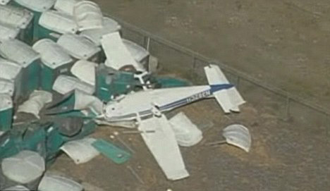 據(jù)英國廣播公司報道,飛機在下墜時先撞到了欄桿,翻了個跟斗,落在了在機場附近停放的移動廁所上。