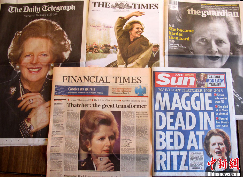 英國(guó)各大媒體頭版報(bào)道撒切爾夫人去世消息