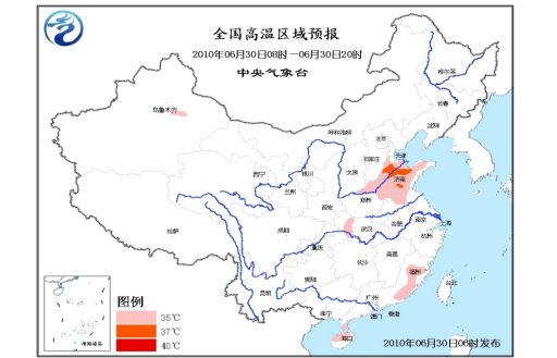 中新網(wǎng)6月30日電 據(jù)中國(guó)氣象局網(wǎng)站消息,中央氣象臺(tái)今日6時(shí)繼續(xù)發(fā)布高溫藍(lán)色預(yù)警,預(yù)計(jì),今天白天,黑龍江、山西等地的高溫天氣將暫時(shí)告一段落,河北南部、河南東部和北部、山東大部、安徽北部、江蘇西北部、湖北西部、福建中南部的部分地區(qū)、廣東東部、海南北部等地將會(huì)出現(xiàn)35~37℃的高溫。另外,預(yù)計(jì)未來(lái)幾天,中國(guó)主要降雨帶將明顯北抬。