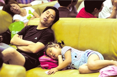 因等候時間太長,疲倦的父女倆在貴賓候車室里睡著了。(圖片來源:京華時報)