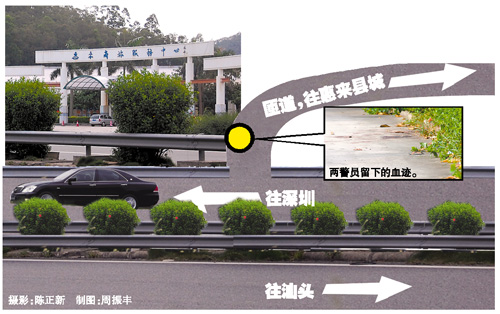 昨日記者來到事發(fā)現(xiàn)場,幾位揭陽市公安局交警支隊惠來高速公路大隊的民警正在現(xiàn)場做警戒。警戒線圍起的事發(fā)地點,就位于深汕高速進入服務(wù)區(qū)路口不遠處。這個路口可以通往惠來縣城,也可通往惠來高速公路大隊。