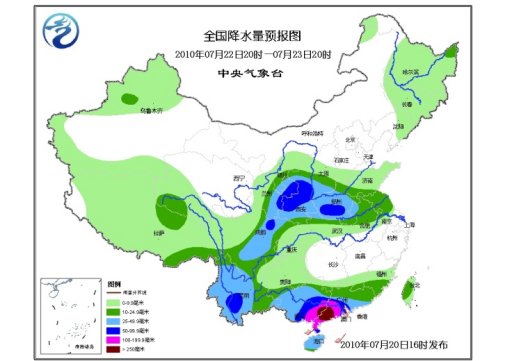 22日20時(shí)至23日20時(shí),新疆南部山區(qū)和天山以北地區(qū)、青海西南部、西藏、內(nèi)蒙古東北部、東北大部、甘肅東部、寧夏、陜西、華北西部和南部、黃淮、江淮、江漢、華南大部、西南地區(qū)大部有小到中雨或陣雨,其中,四川中部和北部、甘肅東部、陜西中南部、山西西南部、河南大部、湖北西北部、廣東南部、廣西大部、海南、云南中西部等地有大雨或暴雨;廣東西南部、廣西東南部等地有大暴雨,局部特大暴雨;上述地區(qū)局部并伴有短時(shí)雷雨大風(fēng)等強(qiáng)對(duì)流天氣。新新疆中部、內(nèi)蒙古西部等地有4~6級(jí)風(fēng)。受熱帶風(fēng)暴“燦都”的影響,南海北部海域?qū)⒂?~9級(jí)大風(fēng),“燦都”中心經(jīng)過的附近海面的風(fēng)力可達(dá)10~11級(jí),部分海域陣風(fēng)可達(dá)12級(jí)。