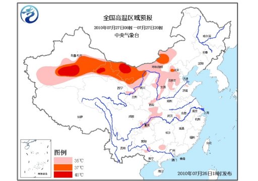 中央氣象臺26日繼續(xù)發(fā)布高溫藍色預警。預計,27日白天,北京南部、河北中西部、山西大部、陜西東部、寧夏北部、重慶大部、湖北西北部和東南部、廣西中部等地有35℃以上的高溫天氣,局地最高氣溫可達37~38℃。