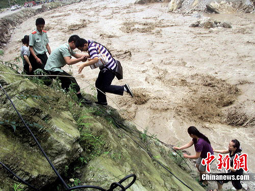 由于連續(xù)的降雨讓綿茂公路漢旺至清平段多處出現(xiàn)的不同程度的塌方,道路中斷。當(dāng)消防官兵行至距離天池高橋段6公里處,山體滑坡留下的滾石和湍急的山洪將去路切斷,消防車和救援船艇無(wú)法前行,情況緊急,中隊(duì)長(zhǎng)田海南迅速命令全體人員攜帶救援裝備涉水前進(jìn)。消防官兵立即將救援橡皮艇放入水中,哪知兇猛的洪流將橡皮艇沖得無(wú)法穩(wěn)槳,被水中的亂石劃破,無(wú)法使用救援工具,行進(jìn)又萬(wàn)分艱難,消防官兵只得摸著山體,踏著過(guò)膝的洪水摸索前進(jìn)。1個(gè)多小時(shí)后,終于到達(dá)了時(shí)發(fā)地點(diǎn)。此時(shí),河床寬度達(dá)20余米,洪流湍急。