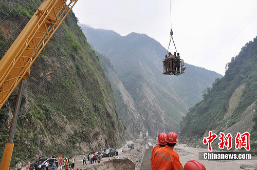 事發(fā)后,綿竹市政府立即調(diào)派大型機(jī)械疏導(dǎo)交通。10時(shí)許,隨著水位下降,綿竹市防洪辦率礦山救援隊(duì)和大型吊車、裝載機(jī)進(jìn)入天池鄉(xiāng)。德陽(yáng)市消防支隊(duì)副支隊(duì)長(zhǎng)李先平也率增援力量到達(dá)現(xiàn)場(chǎng),F(xiàn)場(chǎng)成立救援指揮部,并根據(jù)現(xiàn)場(chǎng)情況部署改進(jìn)救援方案。由于水位下降后,河床寬度明顯減小,指揮部決定利用吊車長(zhǎng)臂懸掛鋼筋鐵框伸過(guò)河床救人,一次可以裝上6、7個(gè)人,大大減少了救援時(shí)間。15時(shí)許,經(jīng)過(guò)全體救援人員的不懈努力,50余名被困人員被成功解救,無(wú)一人受傷。
