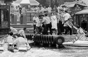 昨天,頤和園舉行了水上救生演練,“游客”昆明湖落水,救援船只在3分鐘內(nèi)趕到救援(見(jiàn)圖)。此外,昆明湖水上還舉行了模擬游船失火、游客被困以及船上發(fā)現(xiàn)爆炸品的應(yīng)急演練。