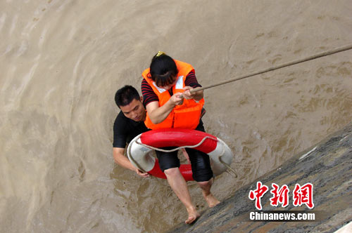 消防官兵搜尋到中攤堡大道,聽到中普建設楓香樹村安置房與中攤堡安置房交界處傳來求救聲音,利用強光手電筒發(fā)現(xiàn):洪水已將4名來不及疏散的施工人員團團包圍,工人在樓頂揮手、呼喊求救!安灰,我們馬上想辦法過來救你們”。由于水流很急且到處都是施工隊挖的暗溝,時間緊迫,消防站余柯政站長來不及多考慮,立即下令,將保險繩拴在消防車上,余站長和劉飛穿上救生衣,綁好安全繩后,帶著救生圈慢慢的游到被困群眾位置,將救生衣為民工穿好后,一邊由消防官兵護送一邊由在消防車一邊的其余消防官兵牽引安全繩接應,緊急轉移被困群眾。一趟、兩趟、三趟……經過近半小時的奮戰(zhàn),成功救出被困工人。