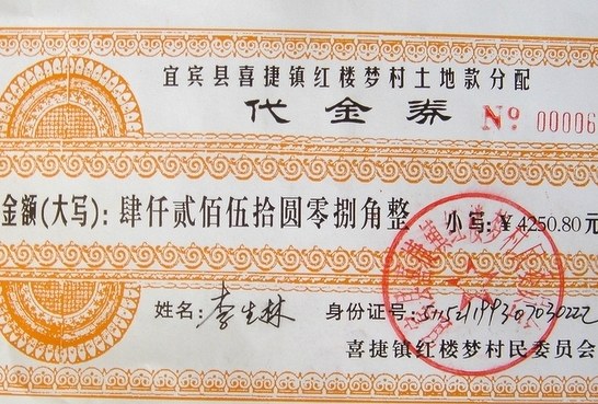 四川宜賓喜捷鎮(zhèn)紅樓夢(mèng)村的村民近日向中國之聲反映,當(dāng)?shù)卮逦瘯?huì)把多年來拖欠農(nóng)民的400萬元土地款印成了精美的代金券,替代人民幣發(fā)給了農(nóng)民。這些代金券可以在本村內(nèi)轉(zhuǎn)讓、贈(zèng)予,還可以繼承。但如果想換成真錢卻要等到60多歲。記者調(diào)查發(fā)現(xiàn),400萬代金券的背后,還隱藏著更大的玄機(jī)。