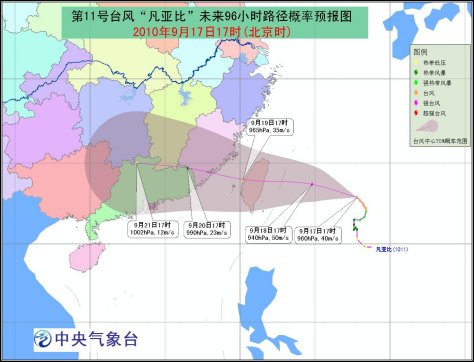 預(yù)計(jì),“凡亞比”中心將以每小時(shí)10-15公里的速度先向西偏北方向移動(dòng),以后逐漸轉(zhuǎn)向偏西方向移動(dòng),移速將略有加快,強(qiáng)度繼續(xù)加強(qiáng),并向我國臺(tái)灣東部一帶沿?拷,將于19日凌晨到白天在臺(tái)灣東部沿海登陸;之后,“凡亞比”將穿越臺(tái)灣島進(jìn)入臺(tái)灣海峽,向福建中部到廣東東部一帶沿海靠近。
