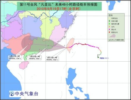 今年第11號強(qiáng)臺風(fēng)“凡亞比”于19日14時在中國臺灣省臺南縣楠西鄉(xiāng)境內(nèi)減弱為臺風(fēng),17時臺風(fēng)中心位于臺南縣七股鄉(xiāng)境內(nèi),就是北緯23.1度、東經(jīng)120.1度,中心附近最大風(fēng)力有12級(35米/秒),中心最低氣壓為965百帕。
