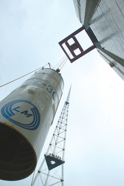 14:21,天空漸晴。二級(jí)火箭終于在一波三折下與一級(jí)火箭成功會(huì)師。16:55,三級(jí)火箭也成功完成吊裝。(占康 秦鵬 李寰)