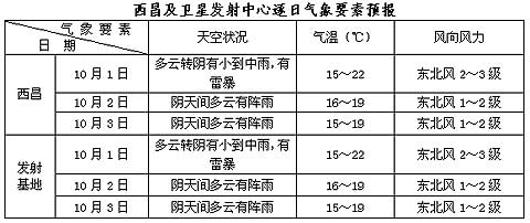 中國(guó)西昌衛(wèi)星發(fā)射中心的權(quán)威發(fā)布:“嫦娥二號(hào)”衛(wèi)星今天(10月1日)晚上即將迎來第一個(gè)發(fā)射窗口。預(yù)計(jì)今天空間天氣平靜,對(duì)嫦娥二號(hào)發(fā)射過程無(wú)不利影響;今天到4日,西昌市及衛(wèi)星發(fā)射基地以陰天或陰天間多云天氣為主,多陣性降水。
