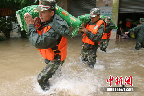 6日8時(shí)10分,瓊海市嘉積鎮(zhèn)橋頭村、塔洋鎮(zhèn)、中原鎮(zhèn)等地區(qū)被洪水淹沒,4500名村民生命危在旦夕。武警一支隊(duì)接到命令后,立即組織200多名官兵,在總隊(duì)副參謀長(zhǎng)宮鐵芳,一支隊(duì)政委肖方明,參謀長(zhǎng)卓世武的率領(lǐng)下,分乘6輛大卡車,攜帶編織袋、救生艇23臺(tái)(艇)、救生衣、鐵鍬、鋤頭火速奔赴抗洪一線,疏散、轉(zhuǎn)移、搶救受災(zāi)群眾,打撈被淹貴重物資。