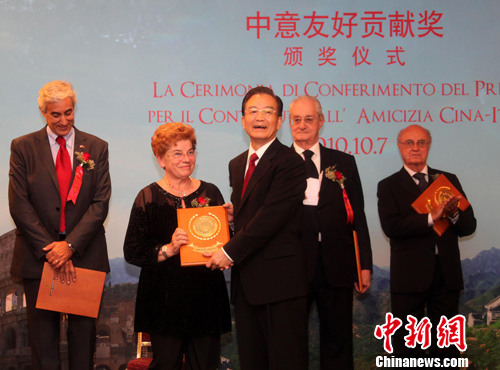 中新社羅馬10月7日電 (記者 周兆軍)中國總理溫家寶7日在羅馬向10位意大利友好人士頒發(fā)“中意友好貢獻獎”,以表彰他們?yōu)榇龠M中意關(guān)系發(fā)展所做的努力。