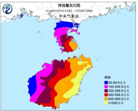 降雨強度大。10月5日08時至6日08時,海南瓊海(701.9毫米)、萬寧(392.2毫米),10月6日08時至7日08時文昌(297.2毫米)日降水量均突破歷史極值。