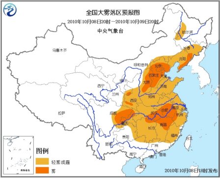 預計,在新一股冷空氣帶來的風雨沒有展開之前,中國中東部還將出現(xiàn)霧霾天氣。中央氣象臺今天下午18時發(fā)布今秋首次大霧藍色預警:預計今天夜間到明天上午,陜西中南部、華北、遼寧、吉林東部、黃淮、江淮、江漢、江南、四川盆地、重慶等地有輕霧或霾,其中,山西東部、河北大部、京津、遼寧東部、四川盆地中部、重慶北部、湖北東部、安徽中南部、江西北部、浙江西部等地的部分地區(qū)有能見度不足1000米的霧,局部地區(qū)能見度不足500米。